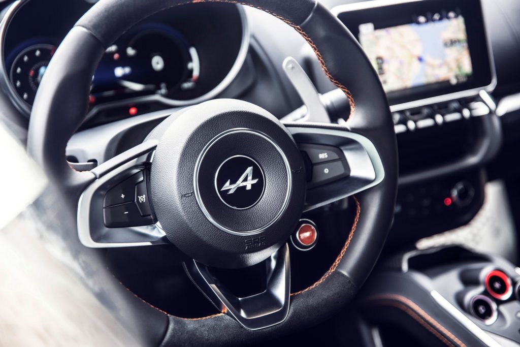 Nell’abitacolo, le cuciture arancioni sostituiscono quelle blu che caratterizzano le altre versioni dell’A110. Il rivestimento in Dinamica nero per il tetto, le alette parasole e i montanti del parabrezza sottolineano la personalità della nuova versione. Anche i sedili Sabelt, che pesano solo 13,1 kg, sono rifiniti in Dinamica. Il volante è rivestito in pelle e Dinamica con “marcatura a ore 12” e impunture arancioni. I pedali e i poggiapiedi sono in alluminio; il tocco finale all’abitacolo è dato dai badge bandiera carbonio e arancione che riprendono quelli presenti sulla carrozzeria.