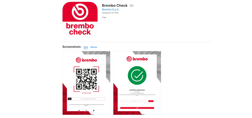 Inoltre, il QR code può essere registrato solo 1 volta, quale ulteriore tutela di originalità verso l’acquirente, a cui si consiglia vivamente di non accettare certificati di autenticità stampati da rivenditori, o terze parti. Al contrario, l’acquirente diventa l’attore principale della verifica del prodotto tramite l’app Brembo Check, che, in caso di esito positivo, invierà direttamente all’e-mail inserita in fase di registrazione il certificato di autenticità.