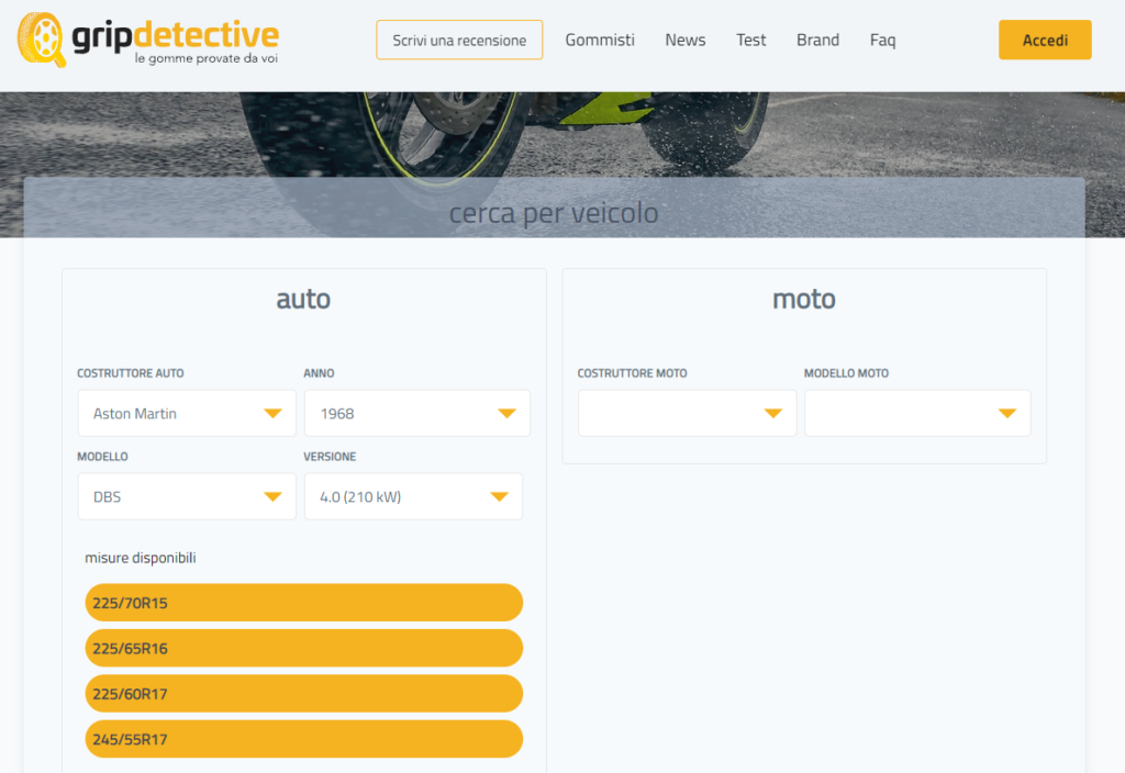 Lo sai che su www.gripdetective.it puoi fare la ricerca delle gomme che ti servono, anche partendo dall’auto…sì anche se fosse una Aston Martin (che invidia! 🙂