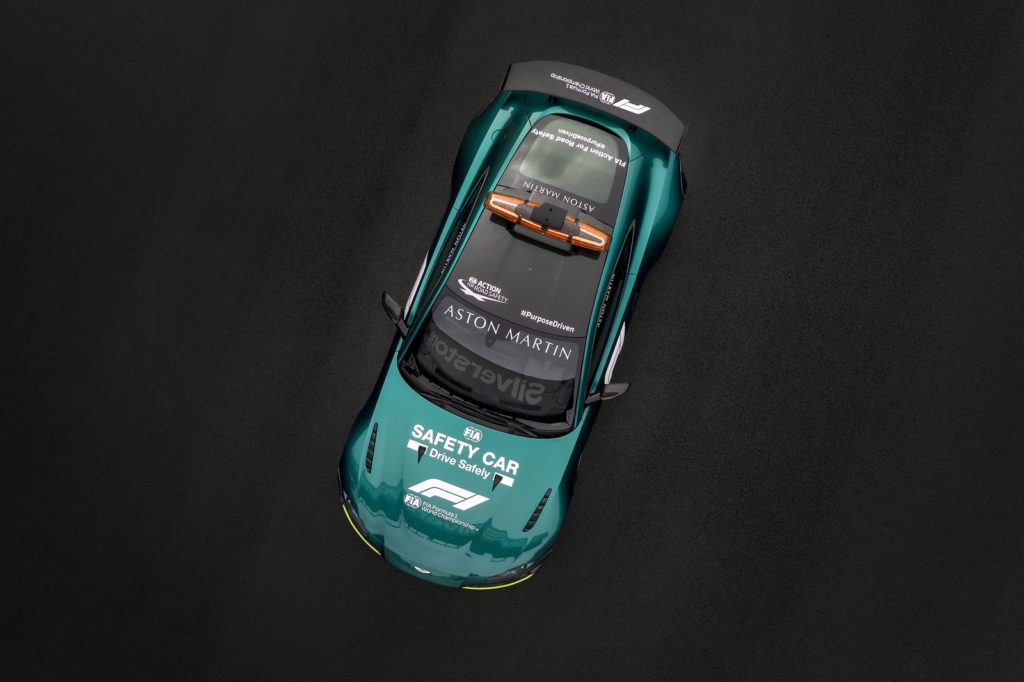 La safety car richiama la macchina dell’Aston Martin Cognizant Formula One Team con il nuovissimo colore della carrozzeria, 2021 Aston Martin Racing Green, sviluppato appositamente per celebrare il ritorno del marchio in Formula 1 dopo più di 60 anni. Una sottile riga nella tonalità Lime Essence mette in risalto lo splitter anteriore; un colore che è sinonimo dei numerosi successi di Aston Martin nelle corse, e usato più di recente sull’imbattibile Vantage, che ha partecipato al Campionato del mondo di endurance FIA. La safety car di F1 è riconoscibile anche dall’esclusiva livrea FIA, dalle antenne radio laterali, dalla targa posteriore a LED e da una barra luminosa personalizzata sul tetto, sviluppata da Aston Martin.