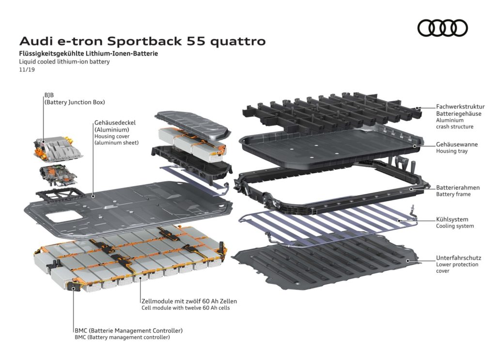 La batteria di Audi e-tron 55 quattro e Audi e-tron Sportback 55 quattro accumula 95 kWh di energia elettrica, dei quali 86,5 kWh effettivamente fruibili, a una tensione nominale di 396 Volt. La raffinata gestione termica garantisce la costanza delle prestazioni degli accumulatori, la loro durata nel tempo e performance di marcia riproducibili anche con marcate sollecitazioni. Il sistema prevede quattro circuiti separati – lunghi complessivamente 40 metri e contenenti 22 litri di liquido refrigerante – variamente combinabili in funzione delle necessità, così da climatizzare l’abitacolo e la batteria ad alta tensione oltre a raffreddare i motori elettrici e i relativi rotori, le elettroniche di potenza e il dispositivo di carica.