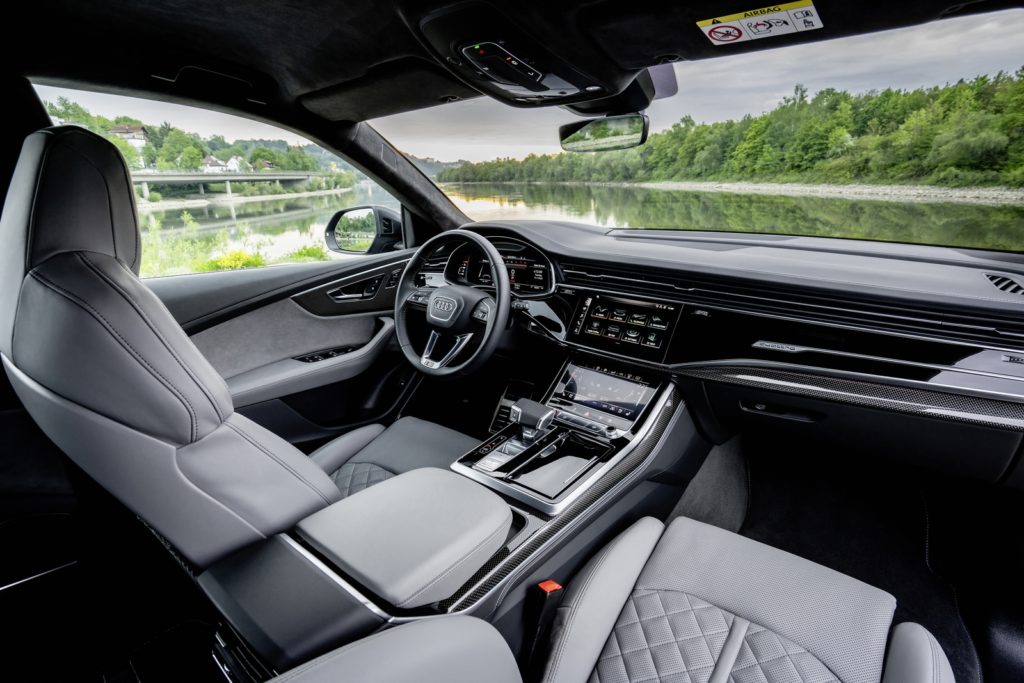 Audi SQ7 TFSI, disponibile anche nella configurazione a sette posti – di serie per l’allestimento sport attitude – e Audi SQ8 TFSI garantiscono un’abitabilità da riferimento, complice il passo prossimo a tre metri. Gli interni sono caratterizzati da linee decise, dall’andamento prevalentemente orizzontale. I sedili sportivi sono di serie; a richiesta, sono disponibili le sedute sportive S plus con appoggiatesta integrati e fianchetti particolarmente contenitivi. Analogamente agli altri modelli Audi S, gli interni si contraddistinguono per le tinte scure e gli schienali sono impreziositi dalla punzonatura del logo S. Quanto ai rivestimenti, è possibile optare per una combinazione di pelle e Alcantara (di serie) oppure, a richiesta, per l’elegante pelle Valcona con impunture a losanghe per i sedili S plus. Gli inserti sono realizzati in alluminio spazzolato opaco; in alternativa, sono disponibili in carbonio o in radica. I listelli sottoporta retroilluminati – gli anteriori con logo S – sono di serie così come la pedaliera e i battitacco in acciaio inox. Il pacchetto luci diffuse e profili in tecnica LED, di serie per le versioni sport attitude, prevede effetti luminosi specifici, rafforzando la sensazione di spaziosità all’interno dell’abitacolo.