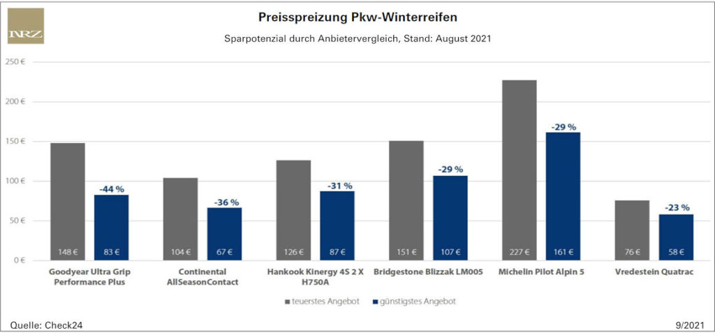 La piattaforma tedesca di confronto prezzi Check24 ha dato un’occhiata ai prezzi dei pneumatici invernali vettura. Più nello specifico, è stato analizzato il trend dei prezzi dei 100 modelli più venduti per la stagione fredda.