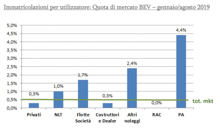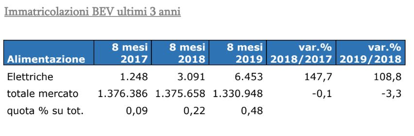 Sono 6.453 le autovetture elettriche immatricolate in Italia nei primi 8 mesi del 2019, in crescita del 109% rispetto allo stesso periodo dello scorso anno, coprendo lo 0,5% del mercato totale.