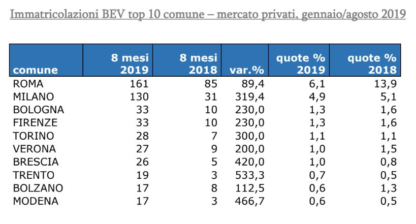 Dal punto di vista geografico, circa i 3/4 degli acquisti di autovetture elettriche si concentrano nel Nord del Paese, mentre la città di Roma rimane al 1° posto per numero di immatricolazioni, pur riducendo la sua quota a meno della metà rispetto al 2018.