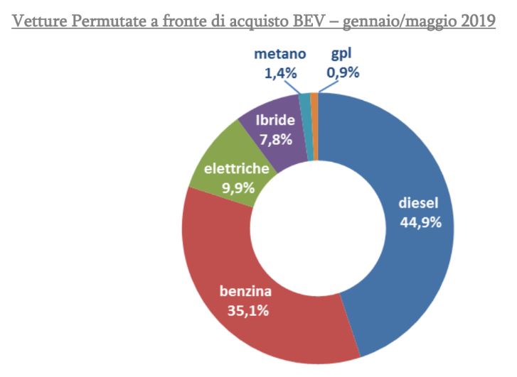 Se guardiamo cosa i clienti hanno dato in permuta a fronte dell’acquisto di auto elettriche, nei 5 mesi di questo anno (periodo nel quale il dato è consolidato) il 45% dei veicoli permutati ha alimentazione diesel, in linea con le tendenze in atto; segue la benzina al 35% del totale. Da segnalare anche un 10% di veicoli elettrici. Ciò è spiegato in parte con le offerte vantaggiose che le Case automobilistiche rivolgono agli utilizzatori di BEV in occasione dell’uscita di nuove versioni del modello in uso.