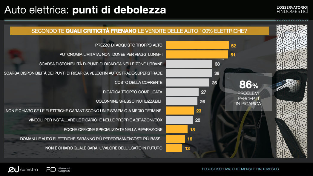 Nella platea di intervistati solamente l’1% ha dichiarato di possedere un’auto elettrica. “A frenare le vendite – commenta Claudio Bardazzi, responsabile dell’Osservatorio Findomestic – sono in massima parte problemi percepiti nell’ambito della ricarica: scarsa disponibilità di punti di ricarica veloci in zone urbane come pure in autostrade o superstrade, costo della corrente elettrica e modalità di ricarica troppo complicate. A cui si aggiunge – continua Bardazzi – per il 52% del campione intervistato prezzi di acquisto troppo elevati e una percezione di autonomia della batteria troppo limitata (51%).”