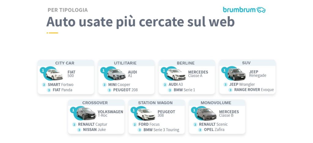 Nella media delle ricerche degli italiani volano anche le berline che si piazzano al terzo posto: Mercedes Classe A vince nella categoria, davanti ad Audi A3 e BMW Serie 1. Quarta posizione per i SUV, in gran spolvero grazie agli ottimi risultati di Jeep, con Renegade che batte Wrangler in cima alla graduatoria. Male invece i crossover, solo quinti nella media delle tipologie di vetture più cercate in rete e con il primo modello in classifica, Volkswagen T-Roc, solo tredicesimo. Staccate e di molto station wagon e monovolume.