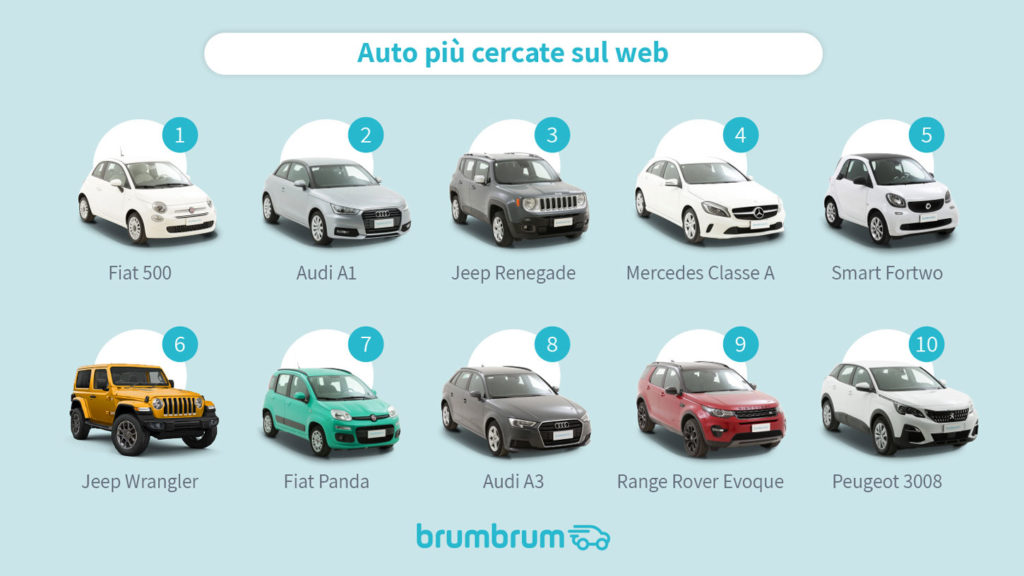 E quali sono le auto usate più cercate sul web? brumbrum, il primo e-commerce di auto ricondizionate e a noleggio a lungo termine online d’Italia che opera sul sito www.brumbrum.it, ha stilato la classifica delle vetture usate più ricercate online in Italia su Google e affini, avvalendosi dei dati raccolti dall’Osservatorio brumbrum, l’Osservatorio interno di rilevazioni e indagini statistiche online in ambito automotive. La classifica parla chiaro e Fiat 500 usata è la più cercata in rete.