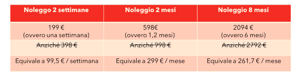 Si potrà acquistare e l’intero importo del noleggio verrà scontato dal prezzo di acquisto. L’offerta lancio sui prezzi del noleggio è valida fino al 31 Maggio.