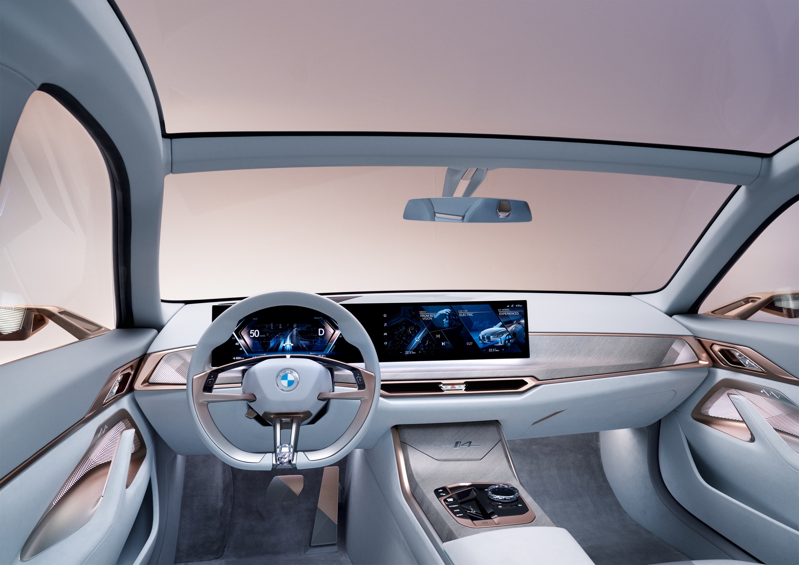 Gli interni: l’innovazione incontra il minimalismo. L’interno della bmw concepti4 si concentra su quei momenti in cui il guidatore sceglie di guidare la vettura in prima persona. Per questo, ogni elemento nella parte anteriore dell’abitacolo è rivolto verso il guidatore. Il nuovo Curved Display bmw si unisce al volante per rivelare una nuova interpretazione dell’orientamento al guidatore e offre un’anticipazione del display delle versioni di produzione della bmw iNEXT e della bmw i4. Qui, le superfici di presentazione del display informazioni e del display di controllo si fondono in un’unica unità inclinata verso il conducente. Questo raggruppamento dello schermo ottimizza la presentazione delle informazioni e rende più intuitivo l’utilizzo del display tramite touch. L’avanzata tecnologia di visualizzazione con vetro antiriflesso elimina inoltre la necessità di una copertura protettiva per oscurare i display e contribuisce quindi a un abitacolo estremamente ordinato e arioso.