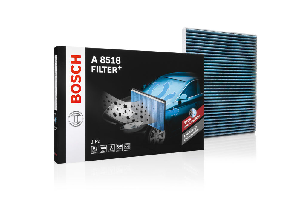 Oltre ai filtri standard, Bosch fornisce anche filtri a carboni attivi. Con questi filtri si trattengono anche i gas nocivi e maleodoranti, riducendo così la concentrazione di sostanze inquinanti all’interno dell’abitacolo. Soprattutto per chi soffre di allergie, Bosch ha sviluppato Filter+ particolarmente performante. Questo filtro separa fino al 99% di tutte le particelle con un diametro fino a 2,5 micrometri – le cosiddette polveri sottili. Con il suo strato antiallergico, neutralizza in modo duraturo anche gli allergeni e i batteri prima ancora che entrino nell’abitacolo. Bosch Filter+ permette quindi di aumentare in modo sensibile la sicurezza stradale come nel caso di attacchi di starnuti – Chi soffre di allergia spesso subisce tali attacchi a causa del polline presente nell’aria lasciando il conducente per un breve momento senza visuale. Anche Bosch Filter+ è dotato di uno strato di carbone attivo che neutralizza in modo efficiente i gas nocivi e maleodoranti.