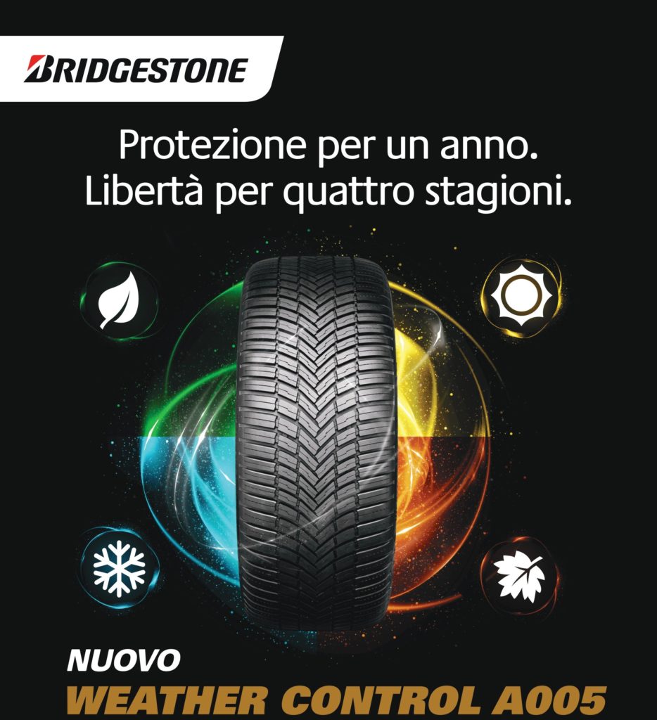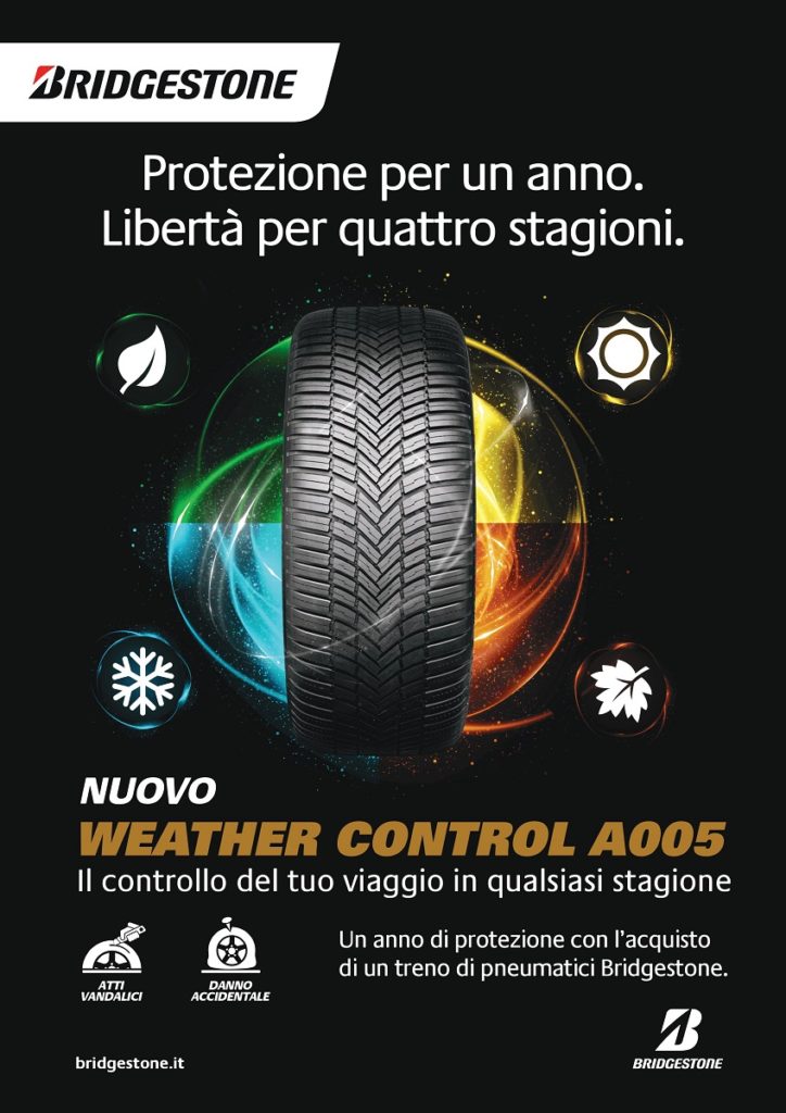 Bridgestone lancia la promozione per tutti gli automobilisti che vogliono godersi il viaggio, in qualsiasi stagione. Dal 1 al 30 Settembre, acquistando un treno di gomme Bridgestone Weather Control A005 presso uno dei rivenditori aderenti, si può richiedere una protezione aggiuntiva, gratuita e valida per un anno, sui nuovi pneumatici. Tale protezione garantisce la sostituzione del pneumatico danneggiato in caso di danno accidentale e atto vandalico.