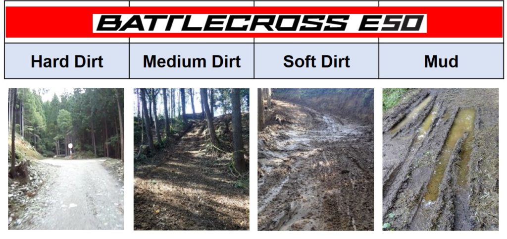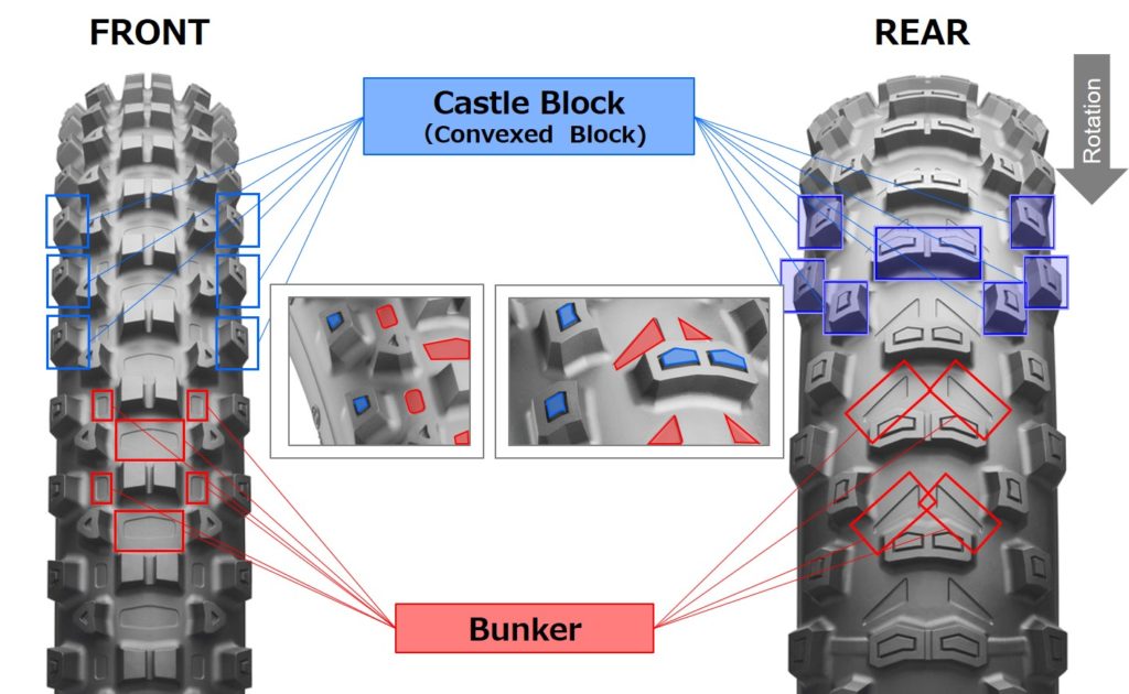I nuovi pneumatici utilizzano la tecnologia proprietaria “Castle Block”, che assicura un grip ottimale anche su superfici scivolose. Uno speciale bordo, chiamato bunker e localizzato alla base del battistrada, permette ai Battlecross E50 di esercitare un forte trazione anche su superfici morbide. Bridgestone ha fatto inoltre uso di simulazioni 3D per ottimizzare la forma e la disposizione dei blocchi del battistrada, garantendo alti livelli di performance in curva con la ruota anteriore e una trazione migliorata con la ruota posteriore.