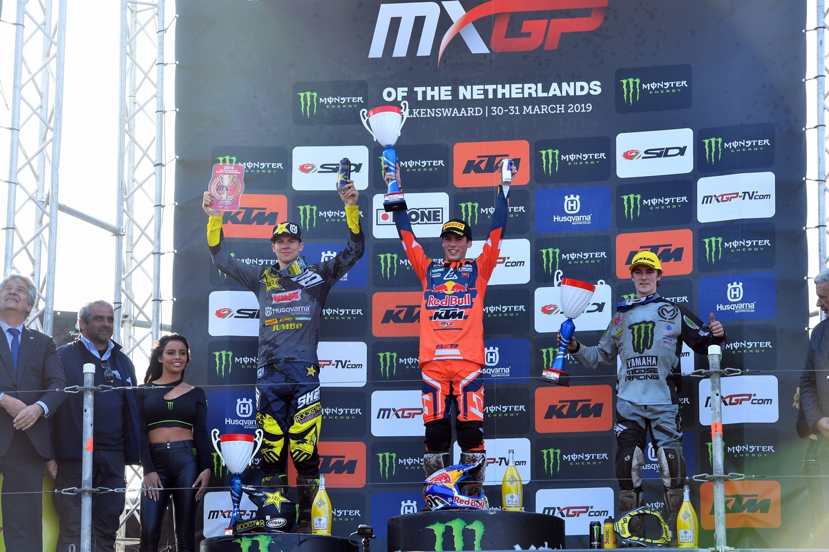 Lo storico tracciato di Valkenswaard, in Olanda, ha ospitato il Gran Premio dei Paesi Bassi, terzo round di diciannove totali del Campionato Mondiale FIM Motocross 2019. Nella classe MXGP Antonio Cairoli non ha lasciato spazio ai suoi avversari per tutto il fine settimana. Il nove volte Campione del Mondo è stato il più veloce nelle sessioni di prova, ha vinto la qualifica di sabato e si è aggiudicato entrambe le manche titolate portando a ventidue punti il suo vantaggio in classifica. Nonostante una caduta in gara uno, Tim Gajser ha chiuso il Gran Premio in terza posizione ed è il primo inseguitore di Cairoli in Campionato. Il pilota privato Jeremy Van Horebeek ha confermato le buone prestazioni delle gare precedenti chiudendo in quarta posizione a pari punti con Gajser.