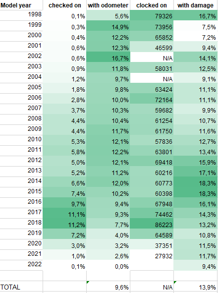 La situazione peggiore è quella delle auto prodotte nel 2014 e nel 2015, dove il 18,3% di tutti i veicoli controllati su carVertical aveva era stata soggetta a danni rilevanti.