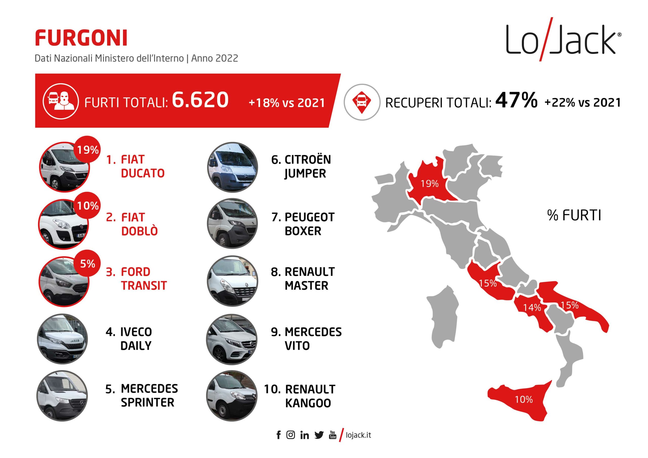 Nella top 5 dei più rubati il Fiat Ducato (1.083) scala due posizioni e supera il Fiat Doblò (581), il Ford Transit (265) e l’Iveco Daily (182), nel 2021 in vetta a questa speciale graduatoria. Chiude il Mercedes Sprinter (164).