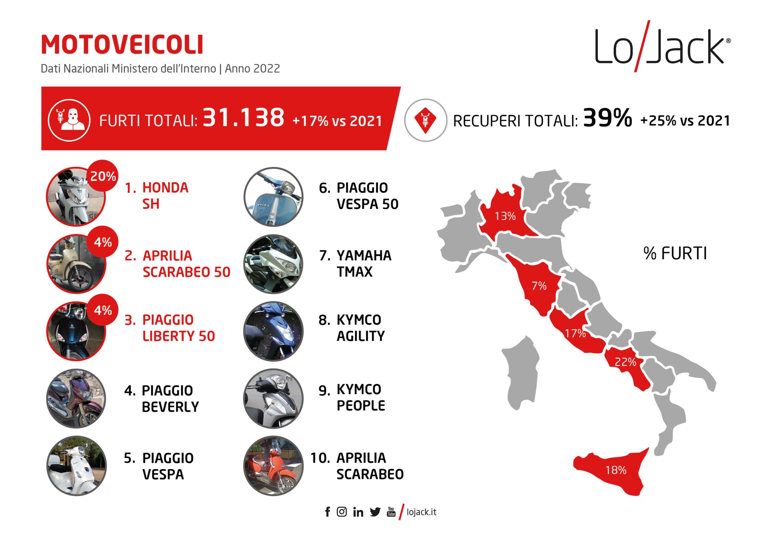 La top 5 dei modelli più rubati conferma il primato incontrastato dell’Honda SH (6.378 unità rubate nel 2022) e segna un paio di sorpassi: il primo ad opera dello Scarabeo Aprilia (1.378) che scalza dal secondo posto il Liberty Piaggio (1.363) e il secondo operato dal Beverly Piaggio (1.114) che supera la Vespa Piaggio (1.040).