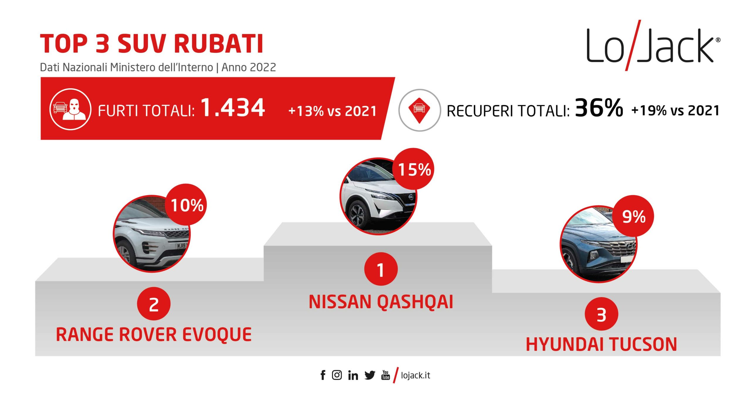Nella categoria SUV, sempre più ambita dai ladri che spesso dopo la sottrazione li instradano lungo le redditizie rotte dell‘Est Europa o del Nord Africa dove vengono rivenduti, i più attenzionati restano, come da tradizione, il Nissan Qashqai, il Land Rover Evoque, lo Hyundai Tucson e il Toyota RAV4.