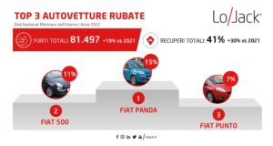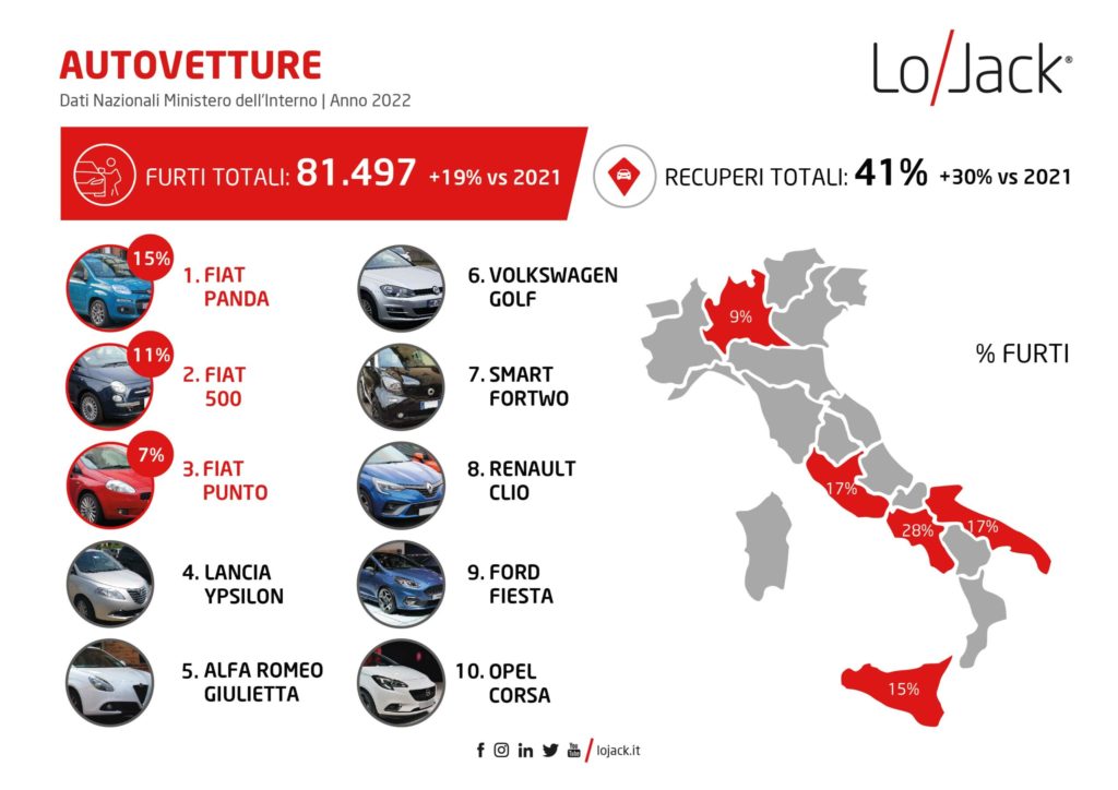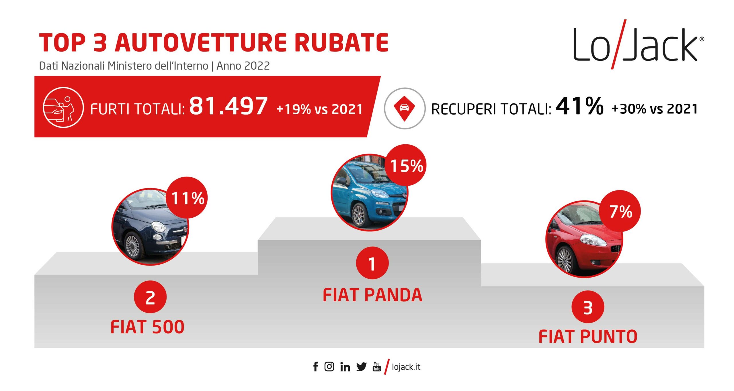 La classifica dei modelli di vetture più rubate non registra stravolgimenti rispetto agli scorsi anni e asseconda il mercato delle vendite. Anche nel 2022 le prime cinque posizioni sono appannaggio dei brand del Gruppo Stellantis con in testa la FIAT Panda con 11.942 sottrazioni (oltre 1 vettura rubata su 10 è Panda), seguita dalla FIAT 500 (8.698), dalla FIAT Punto (5.444), dalla Lancia Ypsilon (3.918) e dalla Alfa Romeo Giulietta (1.658). La Volkswagen Golf riconquista il sesto posto (1.427), a scapito della Smart Fortwo Coupè (1.408). A completare la top ten ci sono la Renault Clio (1.388), la Ford Fiesta (1.157) e la Opel Corsa (910).