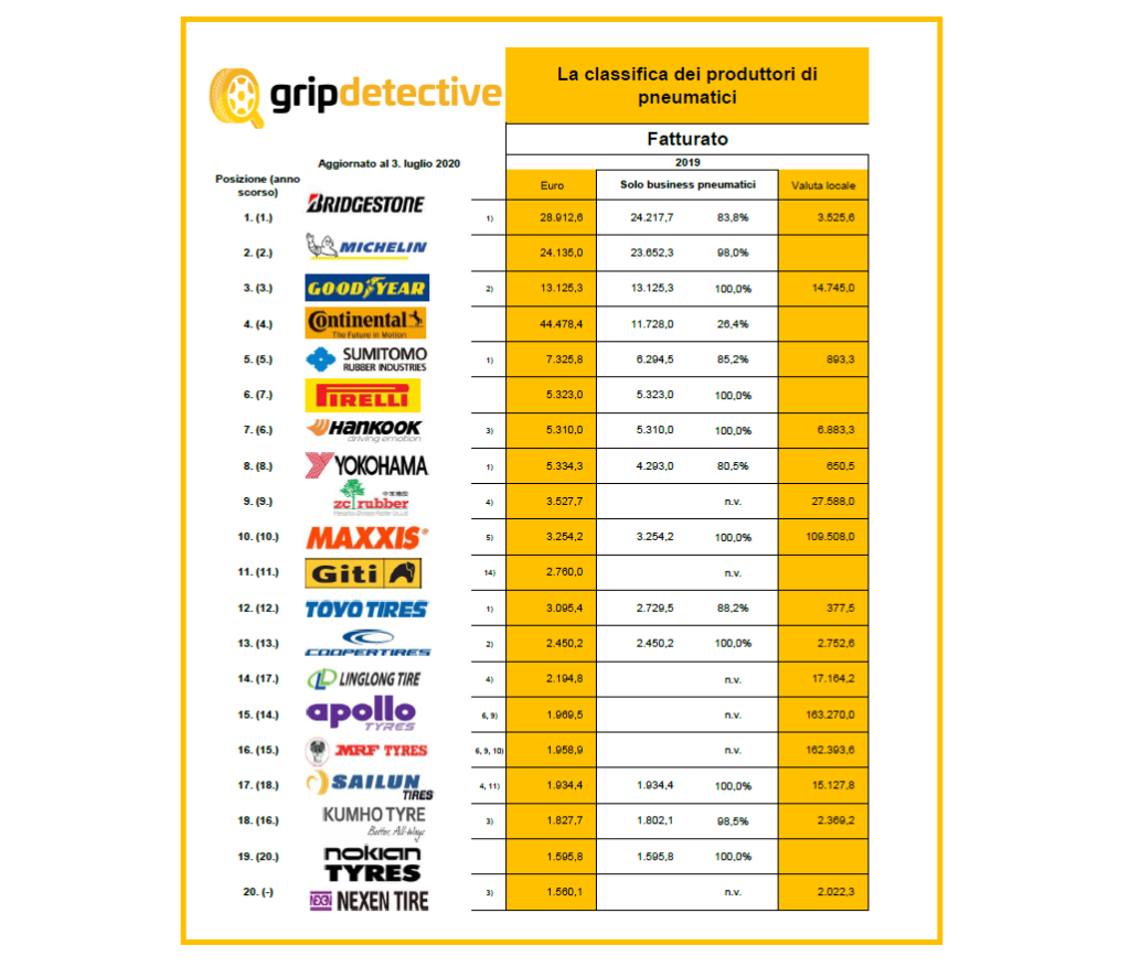 Seguono Nokian, che guadagna una posizione e Nexen, che entra nella Top 20 dei produttori di pneumatici.
