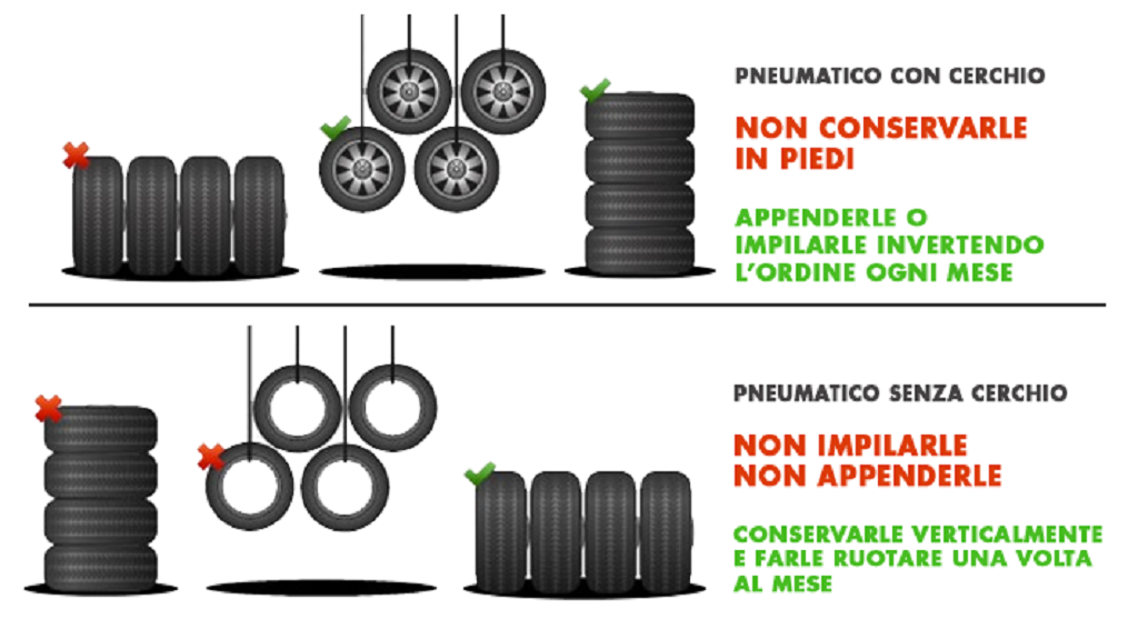 Prima di smontare e conservare le gomme è utile gonfiarle e memorizzarne la posizione, in modo da poterle invertire alla successiva installazione mantenendo un consumo omogeneo su ogni pneumatico. Segnate la posizione dei pneumatici sul veicolo stesso (esempio AD → anteriore destro; AS → anteriore sinistro; PD → posteriore destro; PS → posteriore sinistro)