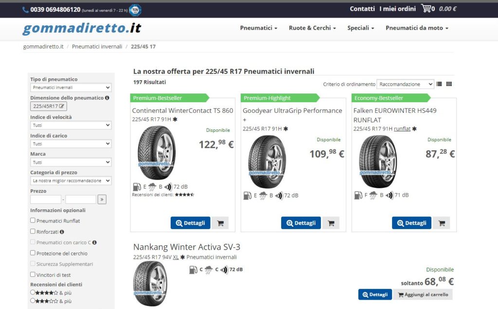 Non resta che provare: inserite la misura o il veicolo nel motore di ricerca di Delticom e cliccare invio, per scoprire la vastità di scelta offerta da Gommadiretto. Inserendo, ad esempio, la misura molto popolare 225/45 R17, otteniamo ben 197 risultati, che vanno da 46 a 285 euro! Il consiglio di Gripdetective è sempre lo stesso: non guardate solo il prezzo, prima controllate con attenzione le caratteristiche tecniche (a fianco di ogni gomma ci sono i valori dell’etichetta) che sono più importanti per la sicurezza, come ad esempio la frenata su bagnato, e solo dopo scegliete!