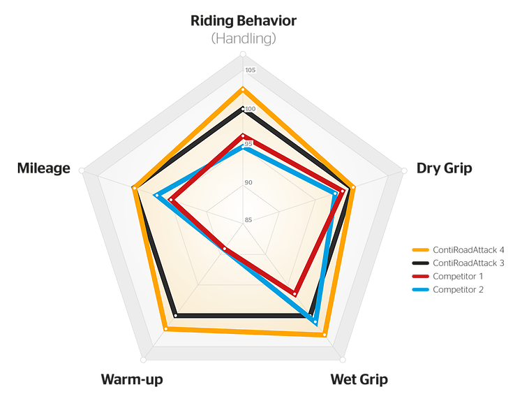 Il nuovo ContiRoadAttack 4 aggiunge la tecnologia GripLimitFeedback per un feedback precoce ad alti angoli di piega. L’area slick nella parte superiore della spalla del battistrada consente la massima aderenza e un’elevata precisione.