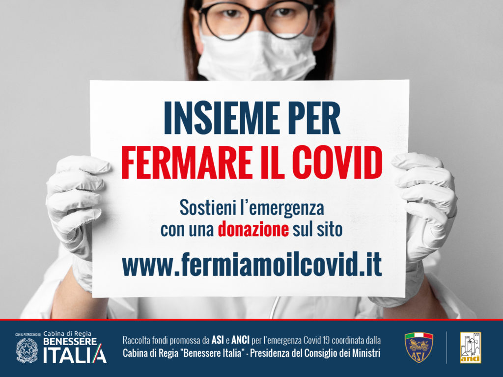 Parte la raccolta fondi “insieme per fermare il covid”: iniziativa congiunta di Asi e Anci coordinata dalla cabina di regia Benessere Italia della Presidenza del Consiglio dei Ministri contro il coronavirus.