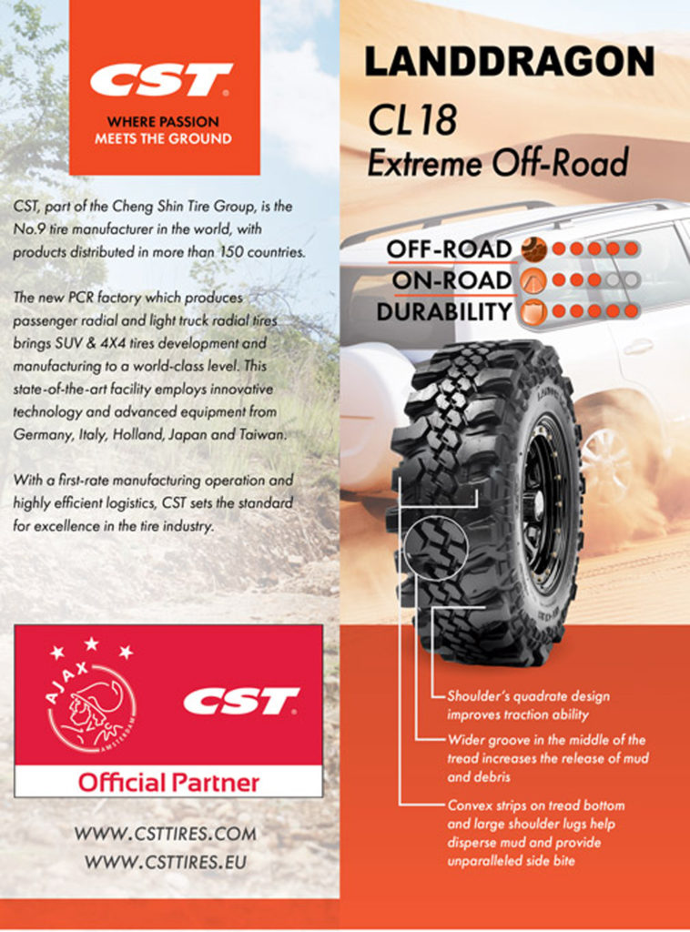 Alla ricerca di gomme POR? CST Land Dragon CL-18 è un pneumatico all terrain POR (Professional Off Road) specifico per il 4×4 capace di accompagnare il mezzo e il suo proprietario attraverso qualsiasi percorso, superando qualsiasi ostacolo, non fermandosi davanti a nulla. Per sapere cosa sono le gomme POR, CLICCA QUI