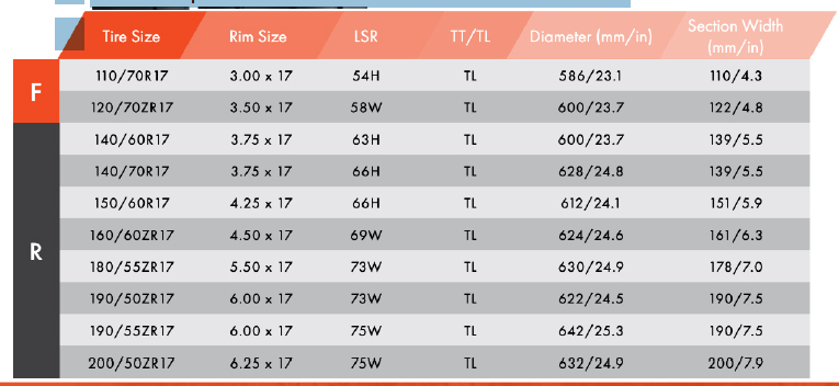 - 140/70 R17 – 3,75 × 17 – 66 H TL – diametro 628 mm – larghezza 139 mm