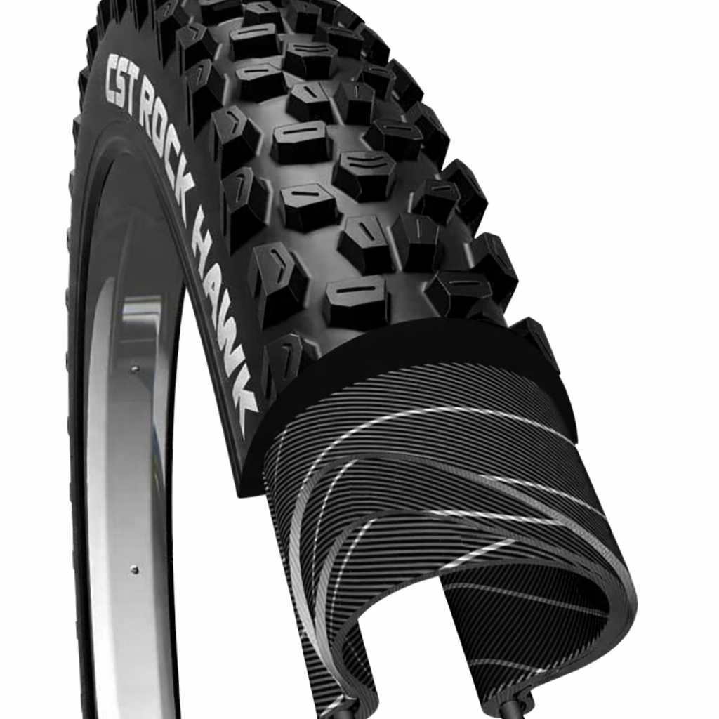 Rock Hawk è uno pneumatico per All Mountain, ma adatto anche all’XC e all’Enduro, con un battistrada aggressivo, ma uniforme, caratterizzato da tasselli ampi e ben distanziati: una scelta mirata a favorire la pulizia del battistrada e lo scarico di fango e detriti in tutte le condizioni, anche le più complicate. Per contenere la resistenza al rotolamento, mantenendo buon grip in salita in termini di trazione, CST Tires ha inoltre lavorato sui tasselli centrali, inclinandoli e cercando pertanto di mantenere una buona scorrevolezza senza snaturare la vocazione “trail”. Rock Hawk è dotato di ottima frenata e ha un comportamento in curva performante su fondi misti e compatti. Ha il cerchietto pieghevole, la protezione antiforatura EPS ed è Tubeless Ready.