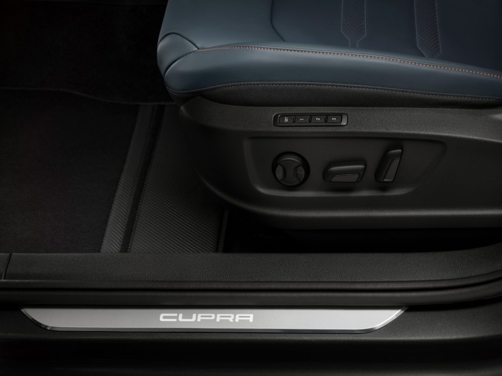 Quando ci si avvicina per aprire la portiera, la luce di benvenuto CUPRA emette un fascio luminoso a terra, dando un assaggio di cosa ci si può aspettare da questa vettura. Anche il battitacco illuminato con la scritta CUPRA conferma le prime impressioni.