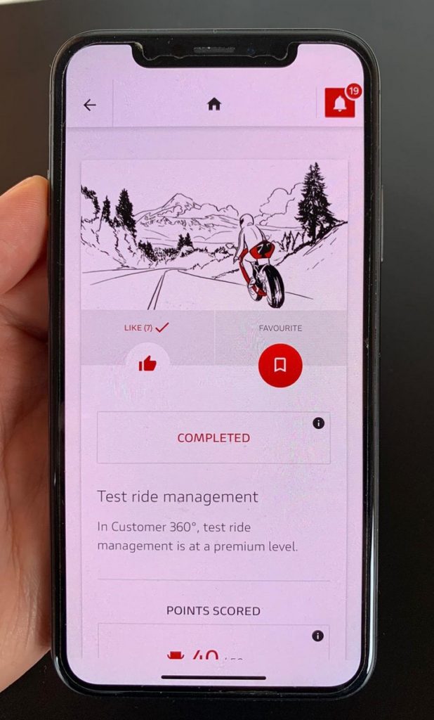 Sia per l’area Sales che After Sales, Ducati ha previsto training online erogati tramite apposita App con un approccio molto efficace e interattivo. Contenuti veicolati settimanalmente e destinati a mantenere il team di vendita aggiornato su tutte le funzionalità dello strumento di gestione della relazione con cliente ed i relativi processi.