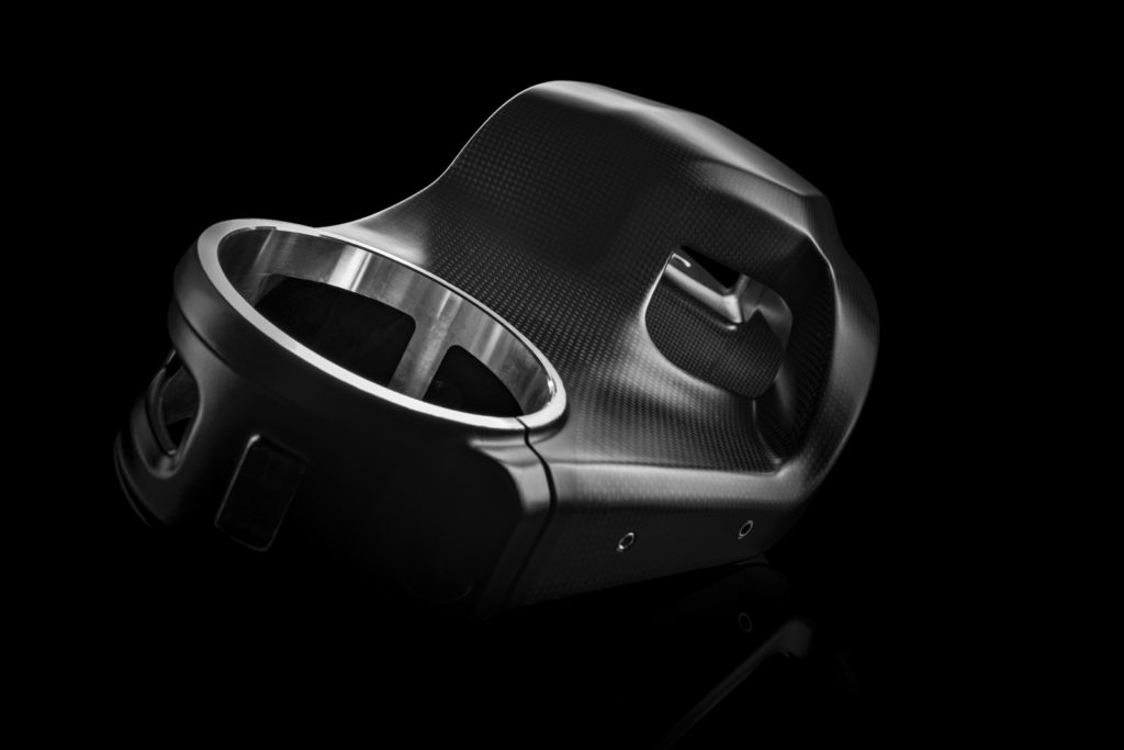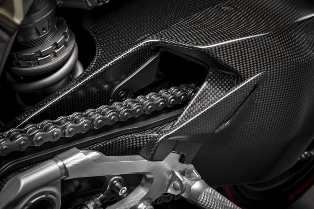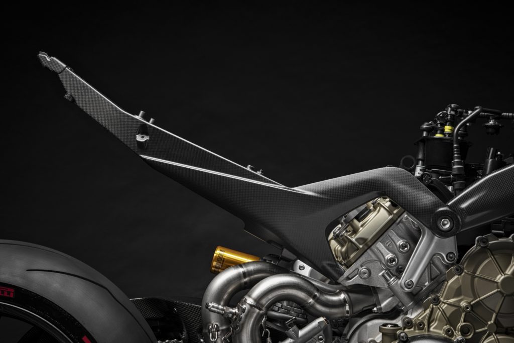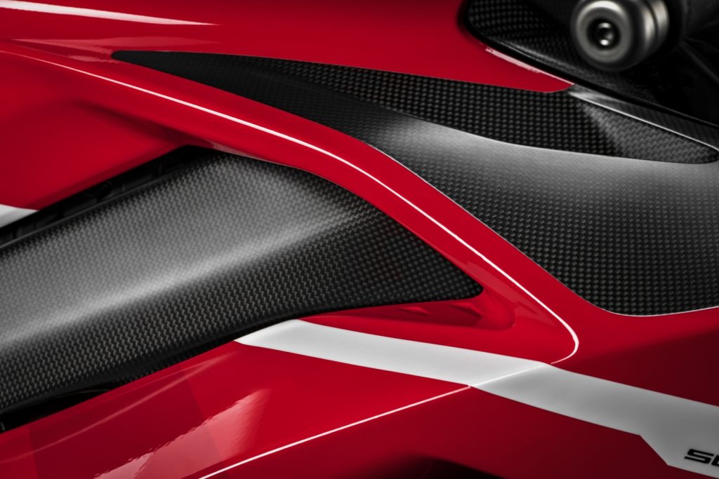 Molti componenti sono realizzati in fibra di carbonio, modellata in forme aerodinamiche avanzate. Tra questi la carenatura, che raggiunge livelli di efficienza superiori a quelli delle attuali MotoGP, limitate in questo dall’attuale regolamento tecnico. Grazie alle appendici aerodinamiche biplano ispirate dalla Ducati MotoGP 2016, la più performante in questo campo, è in grado di garantire un carico verticale di 50 kg di “downforce” a 270 km/h, 20 Kg in più rispetto a quello prodotto dalle ali della Panigale V4 MY20 e V4 R. Questo carico migliora l’accelerazione contrastando la tendenza ad impennare ed aumenta la stabilità in frenata.