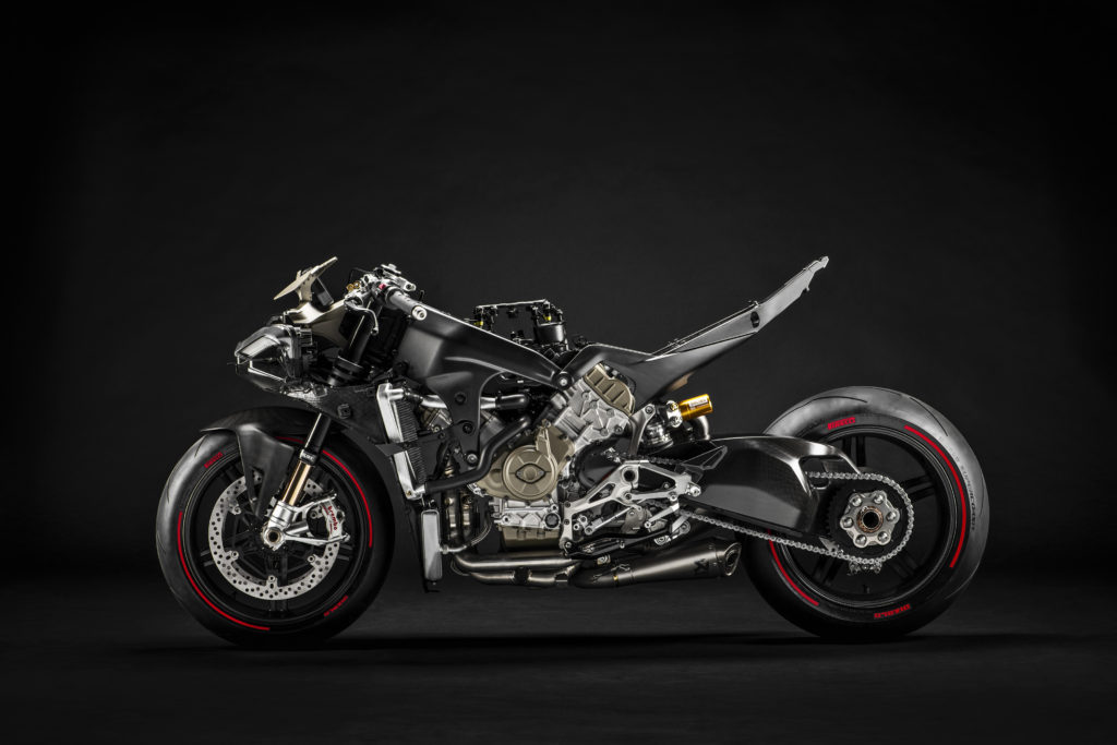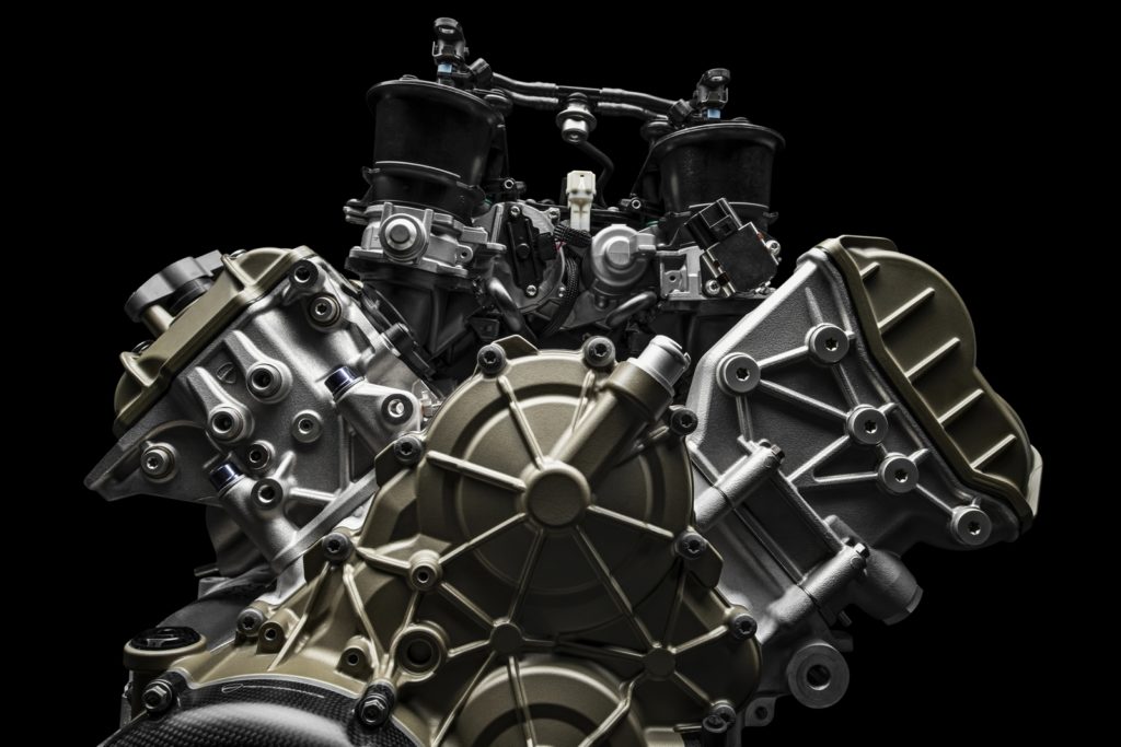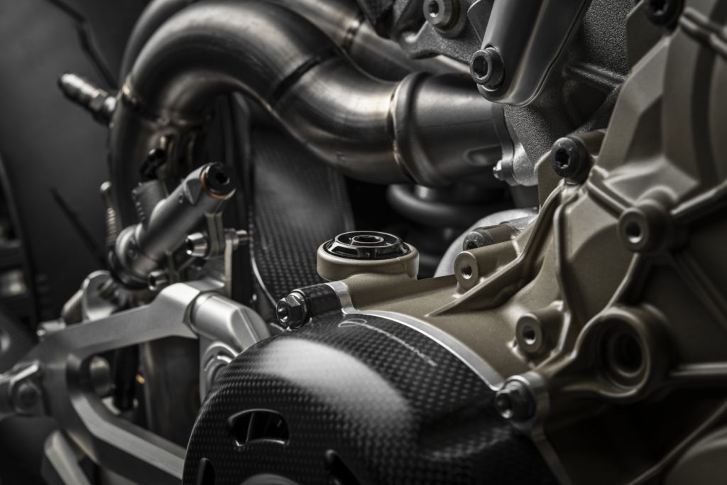 Sotto la pelle di carbonio si nasconde il Desmosedici Stradale R più potente e leggero. Il V4 di 90° da 998 cm3 della Superleggera V4 pesa 2,8 kg in meno rispetto al V4 da 1.103 cm3 e, grazie allo scarico omologato Akrapovič, raggiunge una potenza di 224 CV in configurazione stradale (valore riferito all’omologazione EU), che diventano 234 CV montando lo scarico per uso pista Akrapovič realizzato in titanio, incluso nel Racing Kit fornito insieme alla moto.