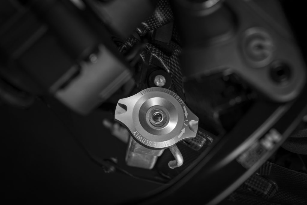 Esempi di massima cura per il dettaglio sono il tappo radiatore in alluminio ricavato dal pieno e la chiave di accensione dedicata con inserto di alluminio su cui è riportato il numero della moto.