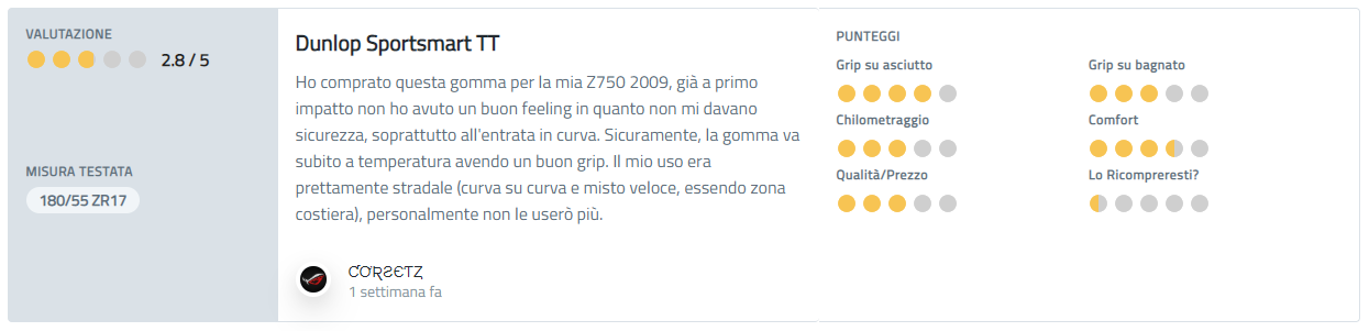 Ho comprato questa gomma per la mia Z750 2009, già a primo impatto non ho avuto un buon feeling in quanto non mi davano sicurezza, soprattutto all’entrata in curva. Sicuramente, la gomma va subito a temperatura avendo un buon grip. Il mio uso era prettamente stradale (curva su curva e misto veloce, essendo zona costiera), personalmente non le userò più.