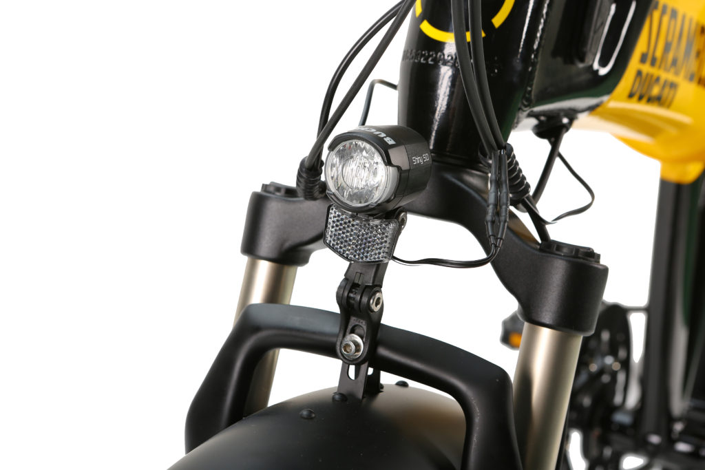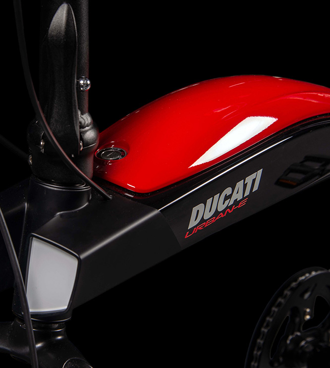 Urban-E , disponibile in versione black o grey, è costruita attorno allo speciale telaio in alluminio con sistema di chiusura easy-folding progettato dai designer del Centro Stile Ducati in collaborazione con i colleghi della divisione Industrial Design di Italdesign. Il manubrio presenta un display LCD completamente integrato nello stelo che permette di controllare tutte le funzioni di assistenza, di verificare la carica della batteria residua e di accendere e spegnere le luci LED integrate nel telaio. Designer e progettisti hanno lavorato per realizzare una e-bike dallo stile pulito e lineare. La batteria da 378 Wh è integrata nel telaio e diventa essa stessa elemento di stile, richiamando nel tipico colore rosso Ducati e nella forma arcuata i serbatoi delle moto. La forcella ammortizzata, gli pneumatici fat 20″x4″ con tecnologia antiforatura in kevlar montati su cerchi a doppia spalla in alluminio e il parafango posteriore, oltre ad accentuare lo stile racing del modello, assicurano il massimo comfort durante la guida, anche nei percorsi più irregolari.
