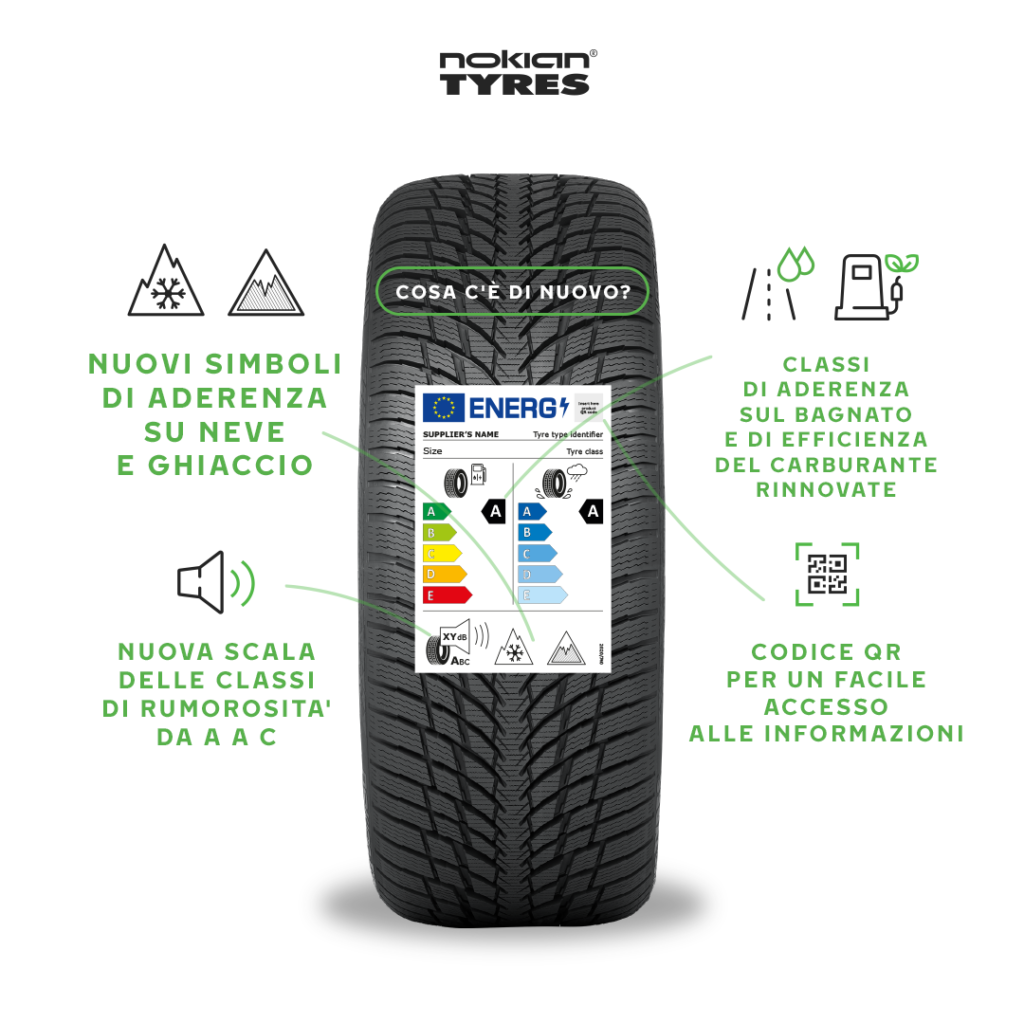 Adesso le etichette stanno cambiando e le informazioni devono includere anche l’aderenza su neve e ghiaccio, inoltre le precedenti classificazioni sono state rinnovate e un codice QR sarà aggiunto all’etichetta. Questo requisito non si applica agli pneumatici invernali chiodati.