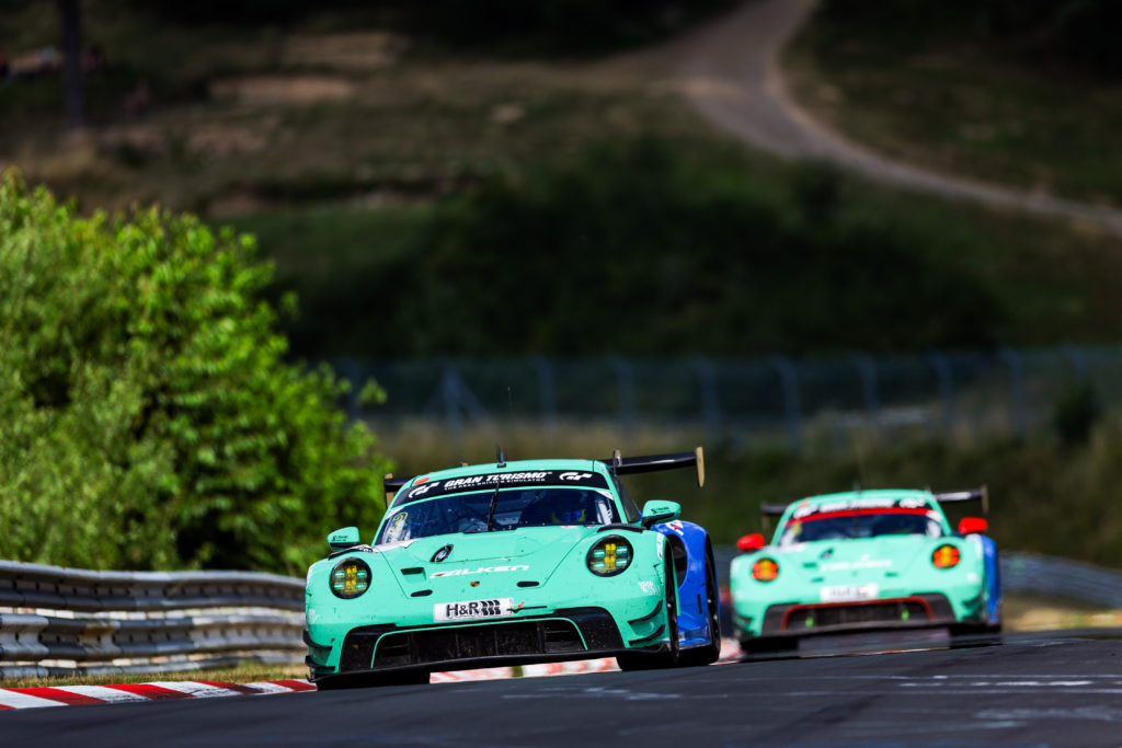 Dopo la partenza della gara di sei ore i piloti Porsche hanno sfruttato il potenziale delle slick Falken. Mentre Pittard ha consolidato la sua posizione tra i primi 3, Martin Ragginger ha iniziato un brillante recupero. Nel corso di pochi giri l’austriaco aveva colmato il distacco dal compagno di squadra, così che da quel momento in poi le due Falken Porsche hanno corso in formazione lungo l’Inferno Verde.