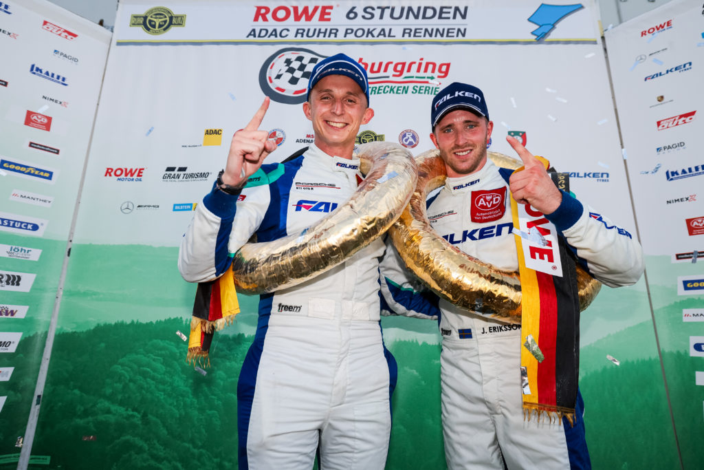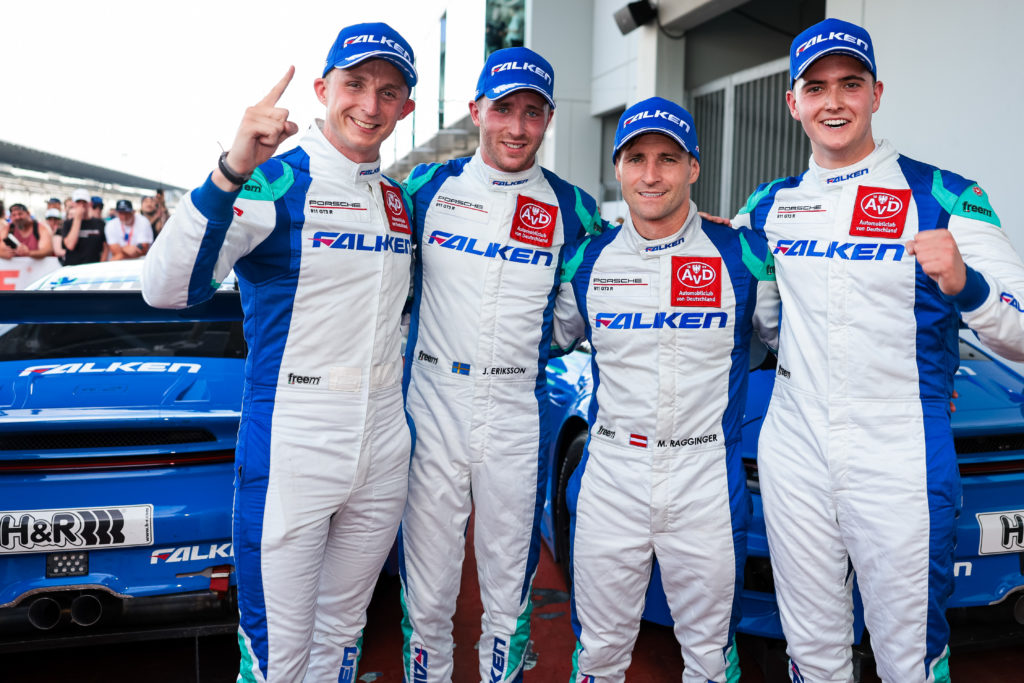 Ottima prestazione di Falken Motorsports nella Nürburgring Endurance Series: alla gara ROWE 6h ADAC Ruhr-Pokal, David Pittard e Joel Eriksson festeggiano una vittoria dominante con la Porsche 911 GT3 R #3 La vettura gemella numero 4 di Martin Ragginger e Dennis Fetzer, che inizialmente aveva chiuso al secondo posto, è stata squalificata dopo la gara.