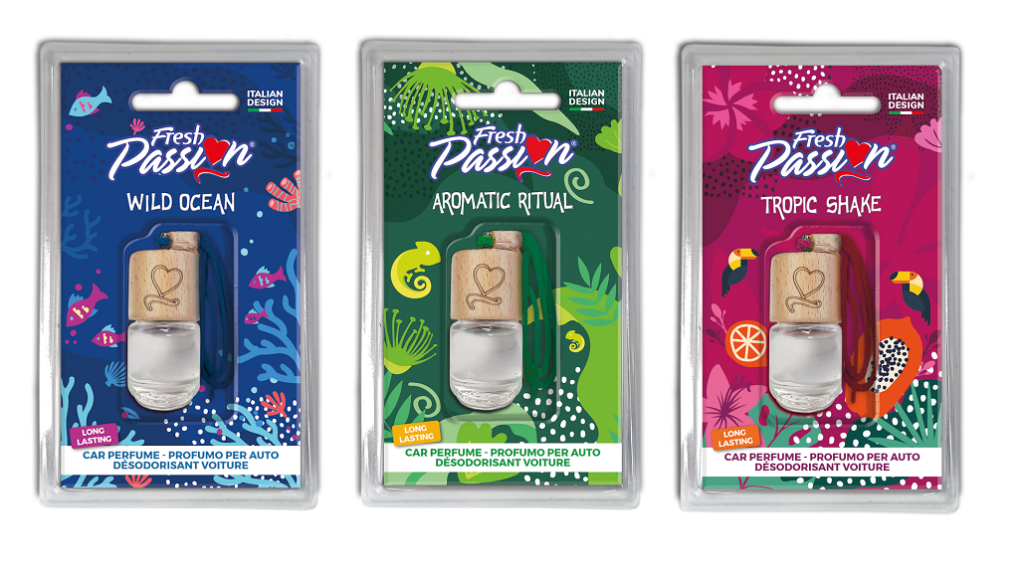 Fresh Passion è un brand di profumatori per auto noto per le sue referenze che accostano fragranze uniche a shape colorate e divertenti. Dopo Lovvo & Sbaffo, i due profumatori a forma di Labbra e Baffi, Fresh Passion ha lanciato un profumatore originale e glamour da regalare all’automobile come prezioso dono: eleganti boccette in vetro sormontata da un tappo in legno con logo serigrafato, da appendere allo specchietto. Si possono scegliere tre fragranze uniche, create per dare un tocco giovane e glam all’automobile.