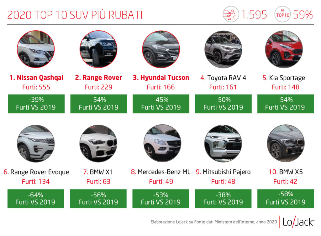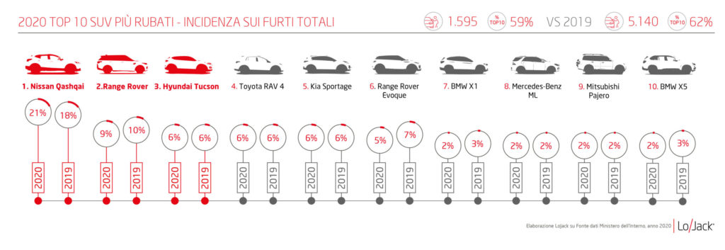 Il SUV più ricercato dai ladri resta di gran lunga il QASQAI (addirittura 1 SUV rubato su 5), seguito dal Range Rover (1 su 10) e dalla new entry Tucson.