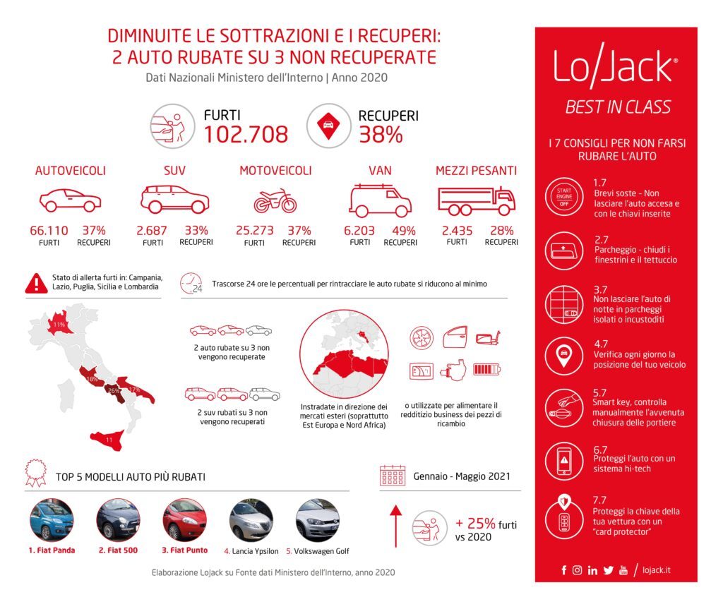 Sono questi i principali trend che emergono dal “Dossier sui Furti d’Auto”, elaborato da LoJack Italia, società del Gruppo CalAmp leader nelle soluzioni telematiche per l’Automotive e nel recupero dei veicoli rubati, che ha raccolto e analizzato i dati forniti dal Ministero dell’Interno sul 2020 e li ha integrati con quelli provenienti da elaborazioni e report nazionali e internazionali sul fenomeno.