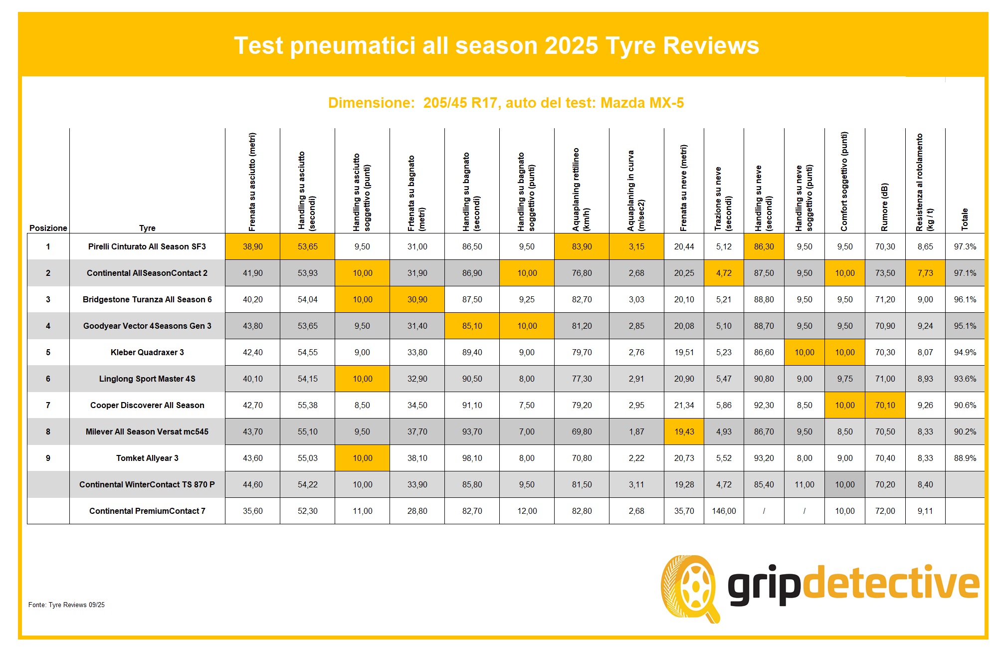 Ecco la classifica della prova sulle migliori gomme 4 stagioni 2025 2026 di Tyre Reviews.