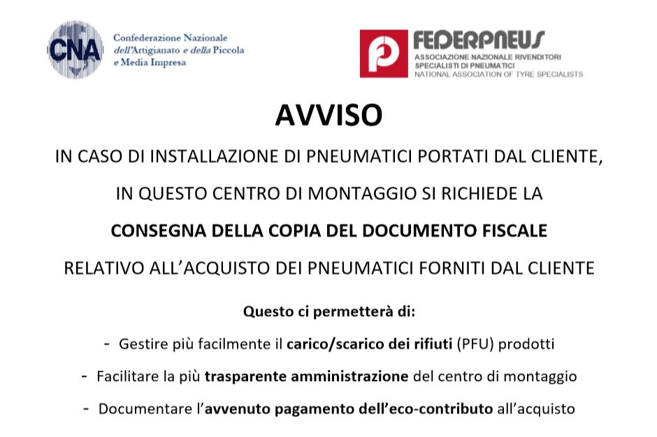Per tentare di arginare, almeno in parte, questa dinamica e per non restare inerti di fronte ai comportamenti illeciti attuati da chi introduce pneumatici sul mercato italiano in modo irregolare, le associazioni di categoria dei gommisti hanno consigliato ai propri associati di appendere nelle officine un avviso alla clientela, dove si ricorda l’obbligo, per chi richiede il solo montaggio di pneumatici nuovi, acquistati altrove, di esibire la documentazione fiscale relativa all’acquisto, dove sia evidenziato anche il versamento del contributo ambientale. E’ infatti un obbligo di legge emettere nel documento di vendita la voce del contributo ambientale come voce distinta.