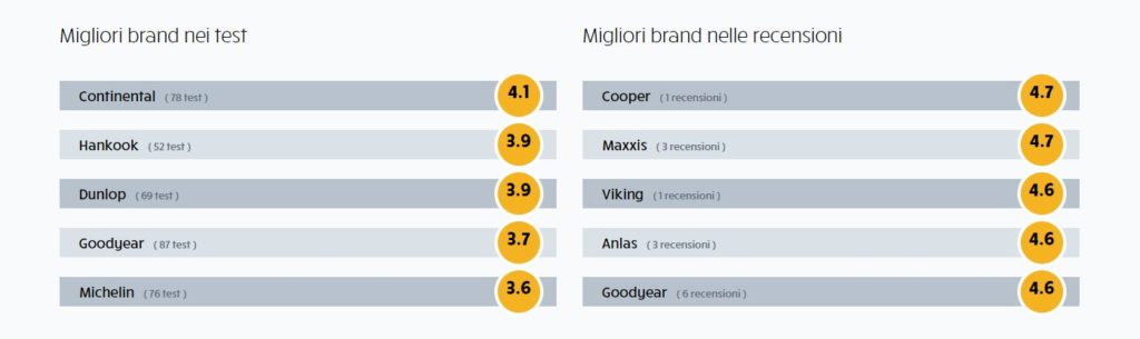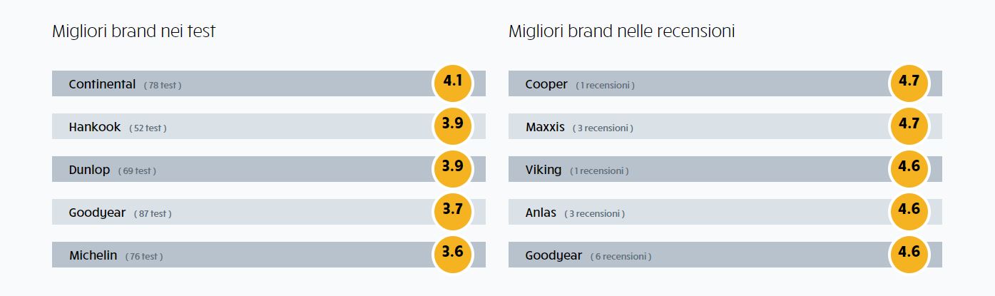 I migliori brand? Secondo i test, Continental, Hankook e Dunlop. Secondo le recensioni dei nostri Gripdetective, ad oggi, Cooper, Maxxis e Viking.