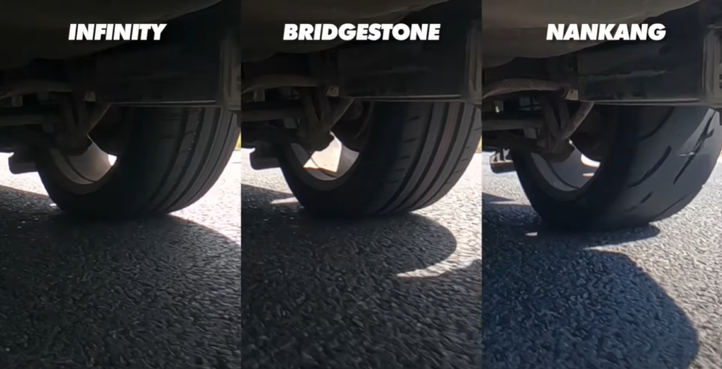 Nel video in oggetto si parla di pneumatici: i tester confrontano delle gomme economiche Infinity Ecomax da circa 70 euro, delle sportive Bridgestone Potenza Sport da 120 euro e delle Nankang Sportnex AR1 semi-slick da 180 euro. Vengono testate anche le Avon ZV7 che erano già montate sulla macchina, per avere un termine di paragone in più.