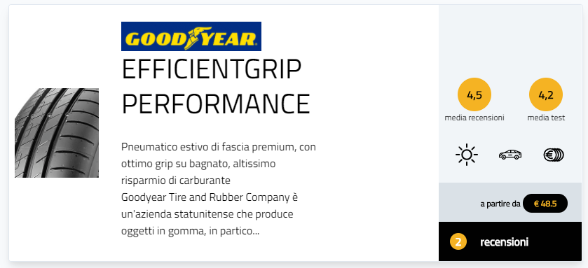 Goodyear EfficientGrip Performance è leader nel segmento HP e si contraddistingue per un elevato chilometraggio e ottime performance di frenata su asciutto e su bagnato e offre caratteristiche eccezionali grazie a una serie di elementi innovativi. L’elevata elasticità e flessibilità del battistrada aiuta a ridurre l’usura; la minore rigidità della mescola facilita la flessione dei tasselli che, insieme a un maggior numero di spigoli, contribuiscono all’evacuazione dell’acqua in condizioni di pioggia; infine, i tasselli del battistrada più larghi aumentano la rigidità del pneumatico in curva, offrendo una maggiore stabilità nelle manovre di emergenza sull’asciutto.